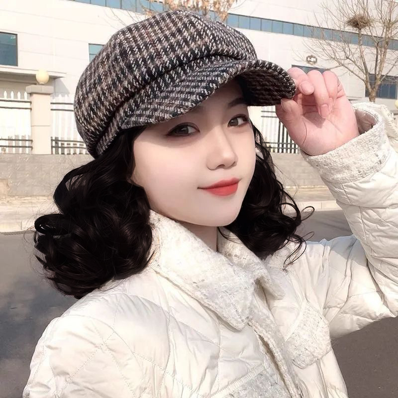 新款秋冬千鳥格假髮一體帽,好看又保暖,自然又逼真,千鳥格貝雷帽造型,立體有型,誰戴誰時尚!